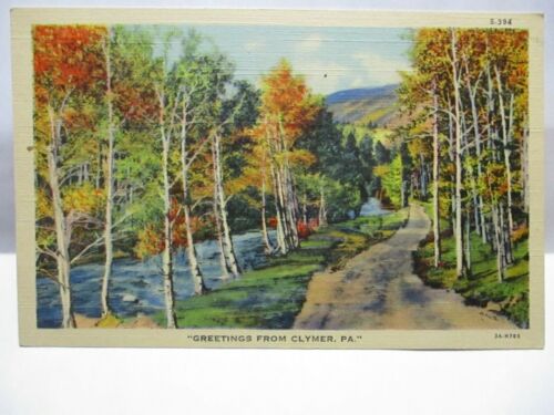 Title (ebay affiliate link): 1940s POSTCARD GREETINGS FROM CLYMER PA, FALL SCENE