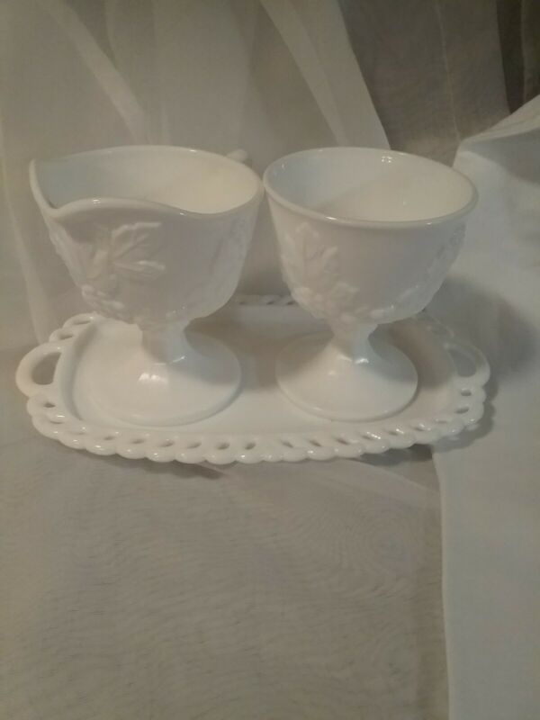 3 Pcs Milk Glass Sugar, Creamer And Tray Set