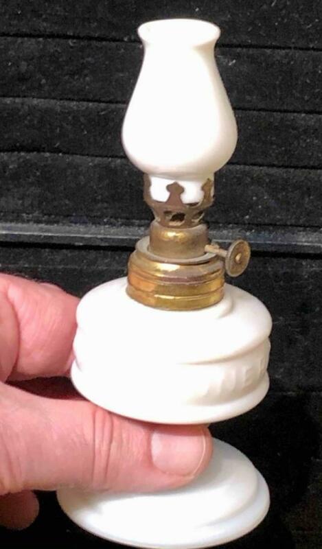 Title (ebay affiliate link): Antique Miniature IMPROVED BANNER Opaque White Glass Oil or Kerosene Lamp