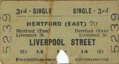 Title (ebay affiliate link): Railway ticket BR Hertford East to Liverpool Street third class single 1955