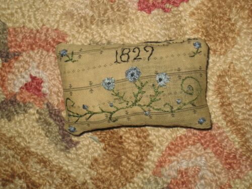 Title (ebay affiliate link): Primitive tiny Sampler Pillow~Blue Flowers~ Early quilt~ Simple Folk Art