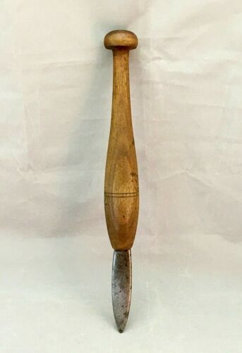 Title (ebay affiliate link): Large Early Antique Forged Carbon Steel Hand Tool Turned Wooden Handle