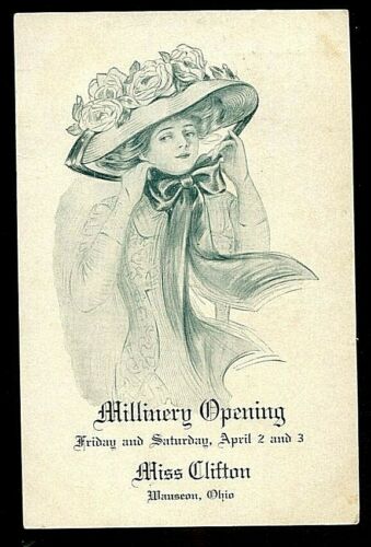 Title (ebay affiliate link): 1909 WAUSEON OHIO WOMAN`S HAT MILLINERY STORE MISS CLIFTON ADVERTISING POSTCARD