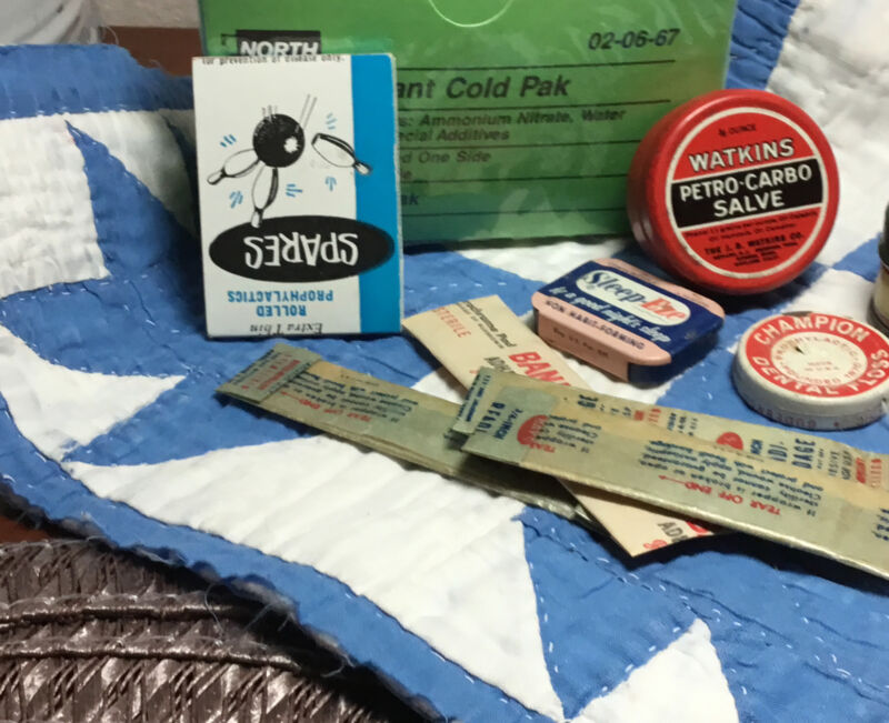 Title (ebay affiliate link): Lot 7 Tins + Salve-bandage-Adhesive-Floss-cb Condom-bowling