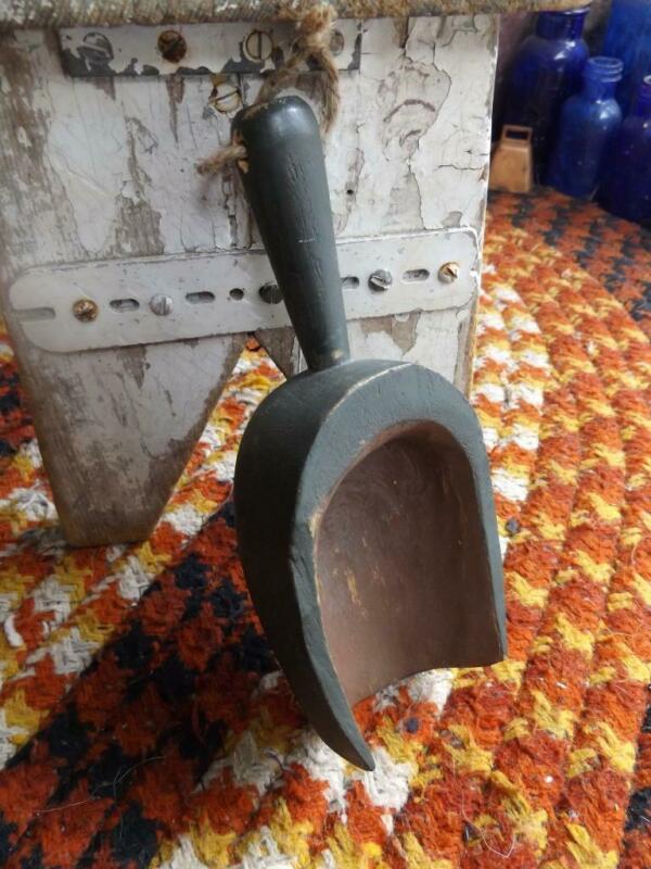 Title (ebay affiliate link): Primitive Vintage Hand Carved Wood Scoop Flour Scoop Moss Green Patina