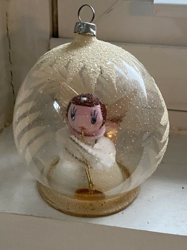 VINTAGE WEST GERMAN DIORAMA GLASS CHRISTMAS TREE ANGEL W/ HORN ORNAMENT MICA