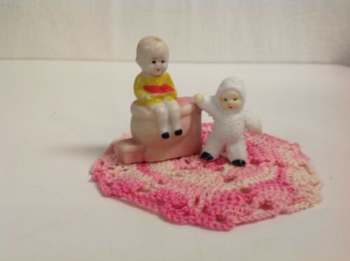 Title (ebay affiliate link): ANTIQUE SNOWMAN SNOW BABY STANDING BY A BABY GIRL SITS ON A BENCH
