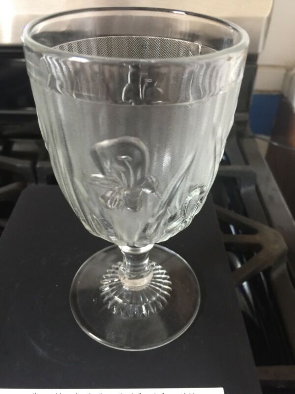 Title (ebay affiliate link): 1 VINTAGE DEPRESSION GLASS IRIS AND HERRINGBONE CLEAR FOOTED WINE GLASSE