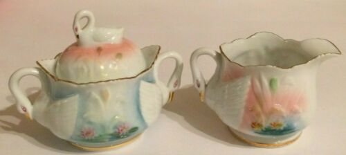 Beautiful Vintage Porcelain Occupied Japan Swan Covered Sugar Bowl And Creamer