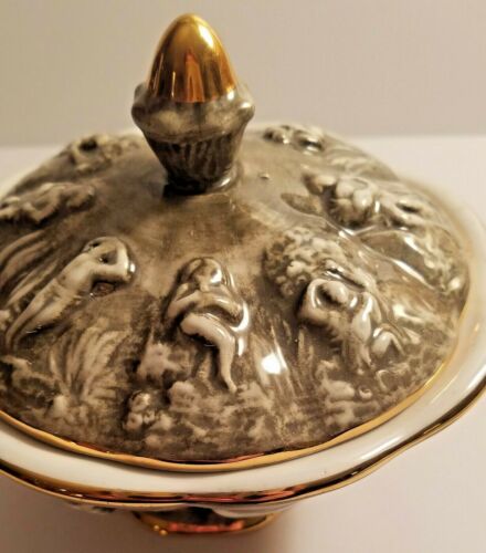 R. Capodimonte Italy #2134 Cherub Covered Candy Dish Gold Trim 5x5" VTG