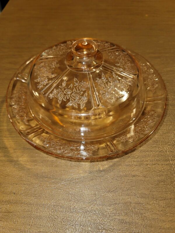 Title (ebay affiliate link): depression glass floral raised peach pink dessert cheese dish with lid