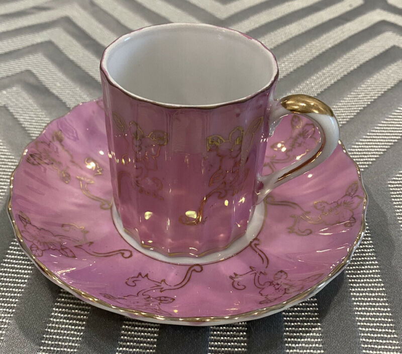 Title (ebay affiliate link): Vintage Porcelain Miniature Pink Tea Cup & Saucer Set Hand Painted Gold Trim