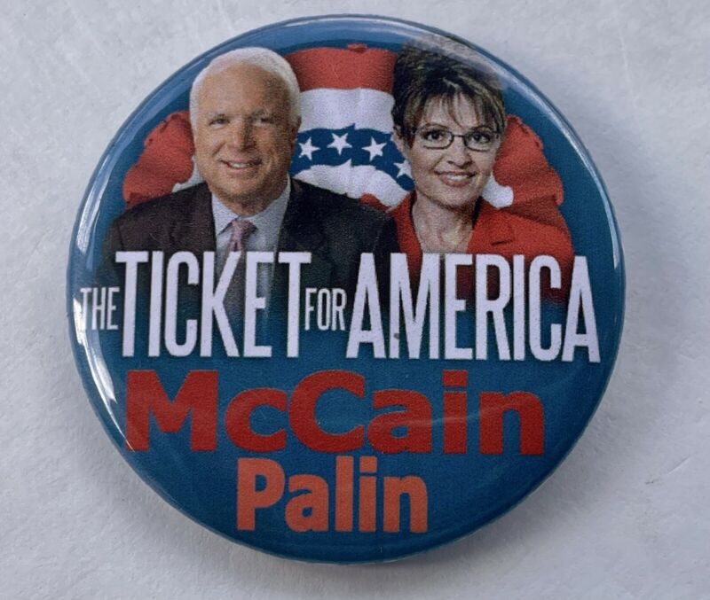 Title (ebay affiliate link): 2008 John McCain & Sarah Palin "The Ticket For America" Campaign Button / Pin