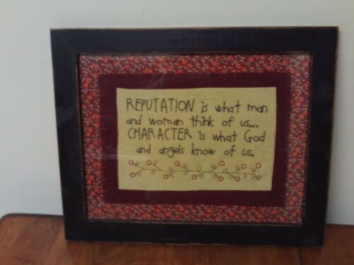 PRIMITIVE~FRAMED FELT STITCHED PENNY RUG WALL HANGING~REPUTATION, CHARACTER, GOD
