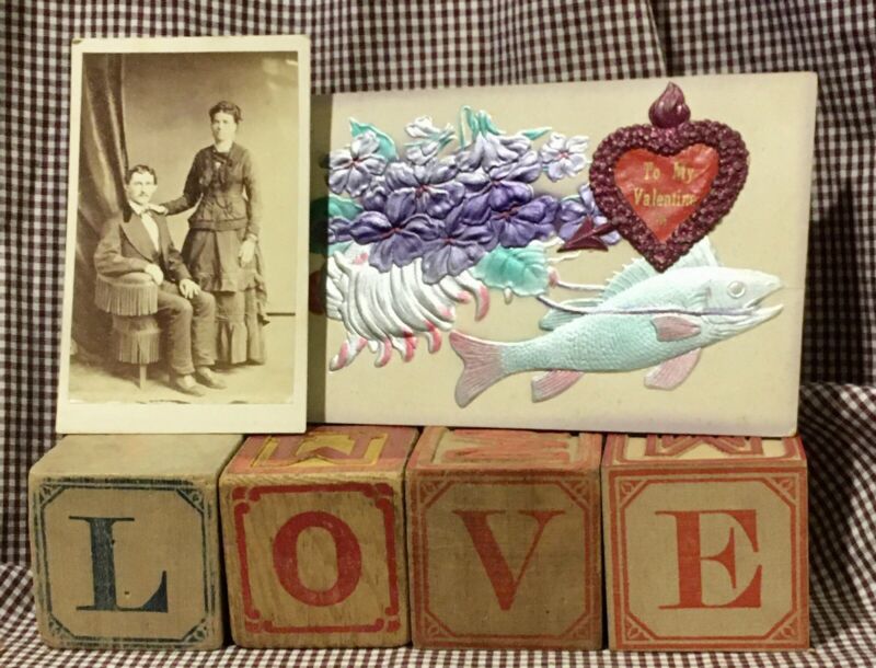 Title (ebay affiliate link): Antique Photo Victorian Couple w Toy ABC Wood LOVE Blocks & Silk Heart Valentine