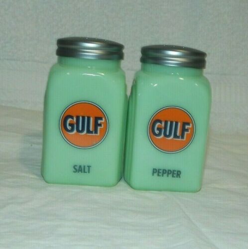 Jadeite Glass GULF Salt & Pepper Shakers w Arch Sides TABLE RANGE