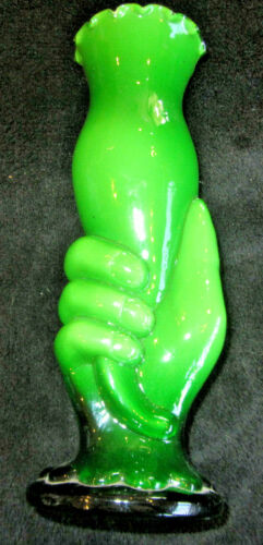 GREEN OVERLAY MILK GLASS HAND HOLDING VASE Cased Glass Victorian Woman''s Figural