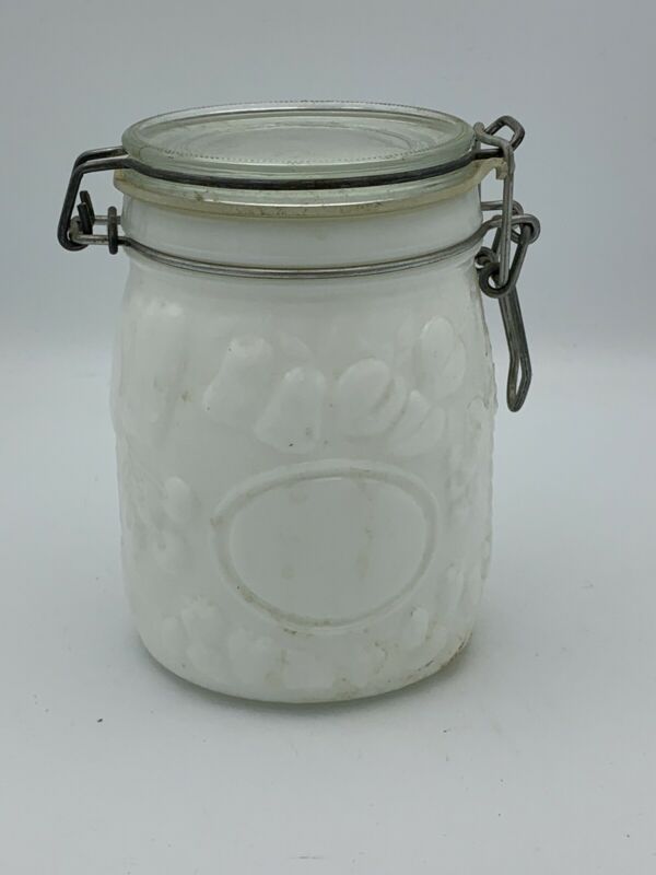 VINTAGE WHEATON WHITE MILK GLASS CANISTER EMBOSSED FRUIT 3/4L