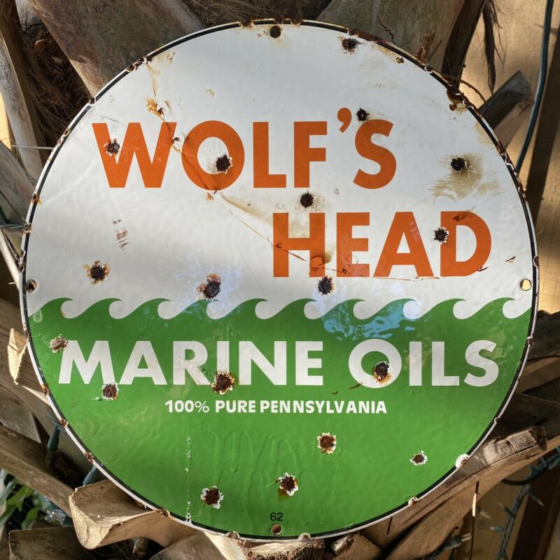 Title (ebay affiliate link): VINTAGE 1962 WOLFS HEAD MARINE OIL PORCELAIN METAL SIGN STATION GAS PUMP PLATE