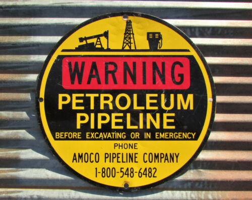 VINTAGE OIL WARNING PETROLEUM PIPELINE METAL SIGN AMOCO gas pump well paint old