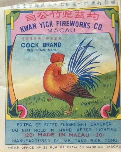 Vintage Cock Brand Collectible Fireworks Label made by Mr. Tang Bick Tong
