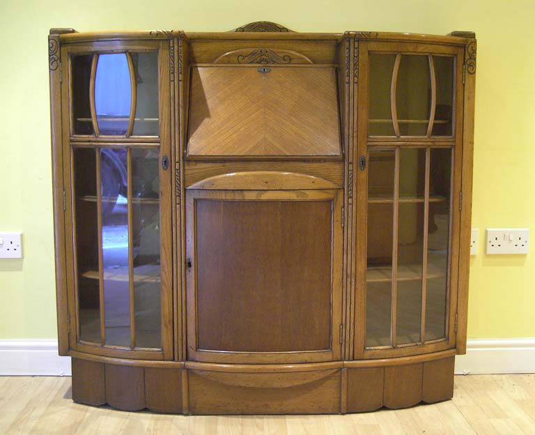 1930's GLAZED OAK BOW FRONT CHINA CABINET/DESK