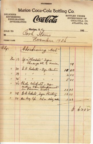 Title (ebay affiliate link): THE MARION COCA-COLA BOTTLING CO. INVOICE DATED NOVEMBER, 1926