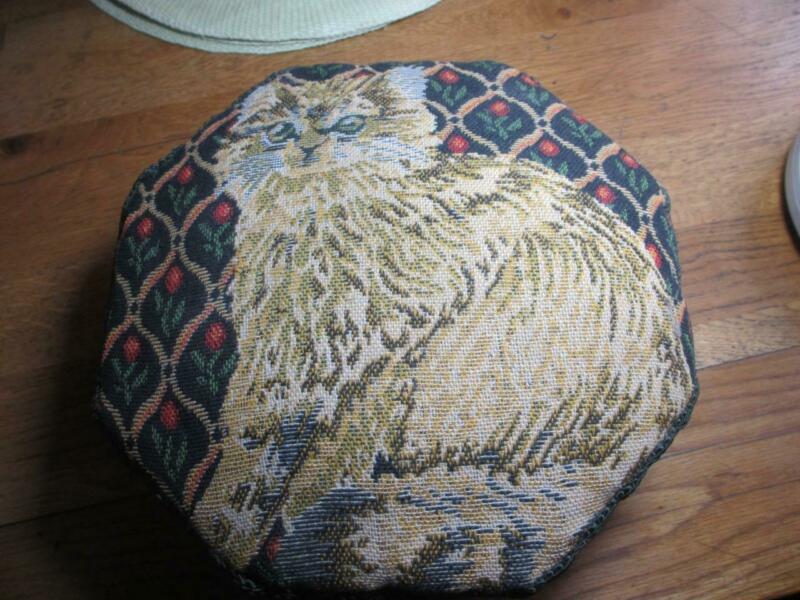 antique Stool Victorian c1880 hex angular embroidered cat tapestry 11x4" 28x10cm