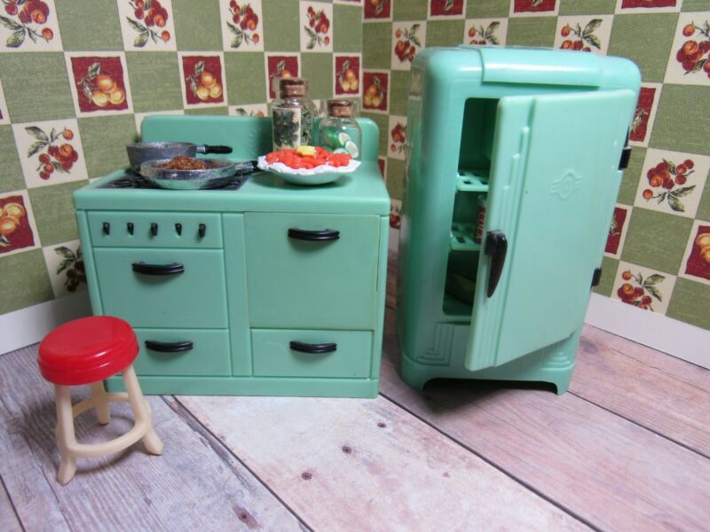 Renwal JADEITE GREEN KITCHEN SET, Vintage Plastic Dollhouse Furniture Ideal 1:16