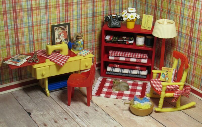 Title (ebay affiliate link): Complete Renwal SEWING ROOM SET, Vintage Plastic Dollhouse Furniture 1:16