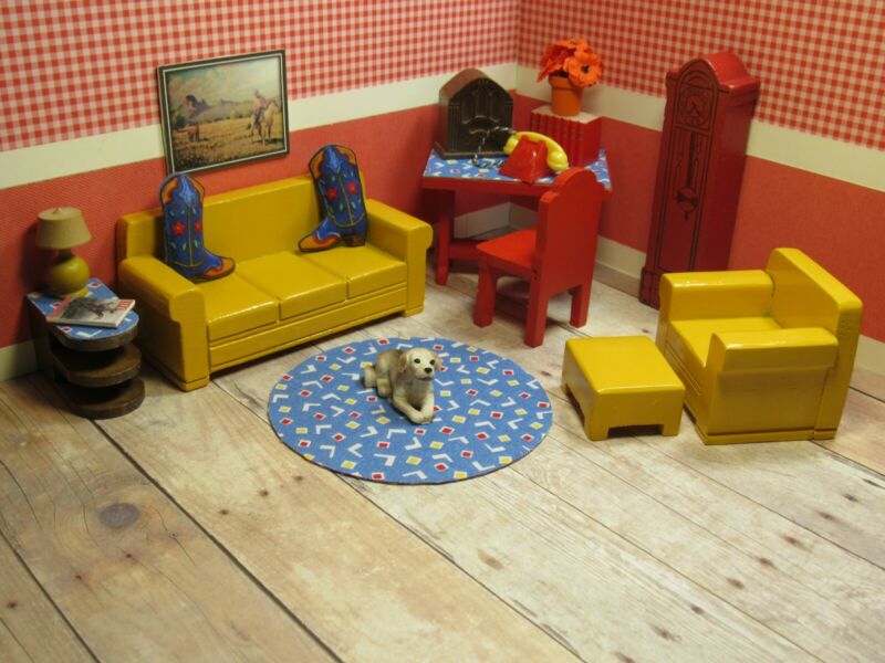 Strombecker NINE PIECE LIVING ROOM SET, Vintage Wooden Dollhouse Furniture 1:16