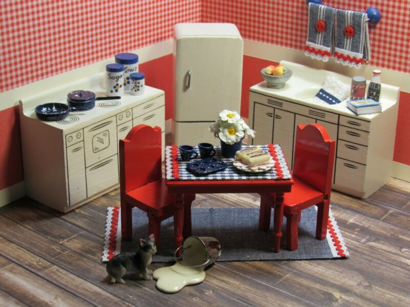 Title (ebay affiliate link): Strombecker KITCHEN APPLIANCE & DINING SET, Vintage Wooden Dollhouse Furniture