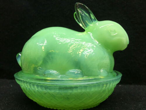 Title (ebay affiliate link): Jadeite Green Milk glass bunny rabbit on nest basket dish easter candy jade eggs