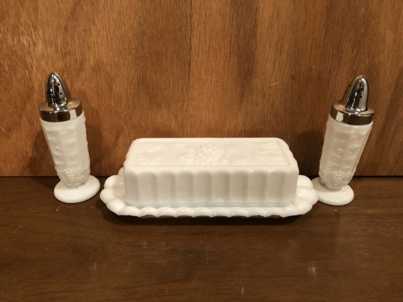 Title (ebay affiliate link): Westmoreland Shakers Butter Dish White Milk Glass Marked Paneled Grape 3 Piece