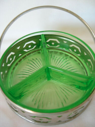 Title (ebay affiliate link): Vtg. Green 3-Part Serving Dish,Uranium Depression Glass & Metal Holder, RARE