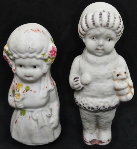VTG Antique Japan Bisque Frozen Charlotte Girl Dolls 2.5" w Flowers & 3'''' w Cat
