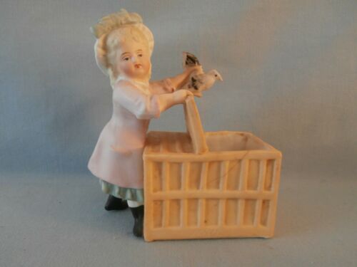 SWEET ANTIQUE VICTORIAN BISQUE GERMAN GIRL FIGURINE W/ BASKET & BIRD