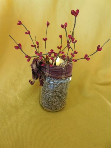 Mason glass jar w/ pip berries,moss,grungy bow & tealight flame less candle
