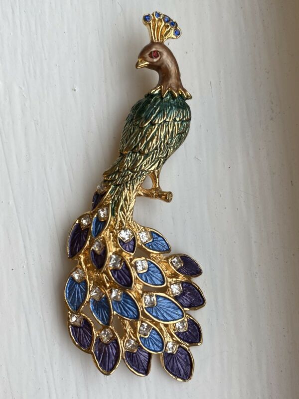 Title (ebay affiliate link): Beautiful Vintage Peacock Brooch Pin Gold Tone Green/Blue/Purp. With Rhinestones