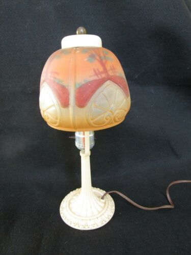 Small 14" Antique Vintage Cast Iron Table Lamp with Glass Shade
