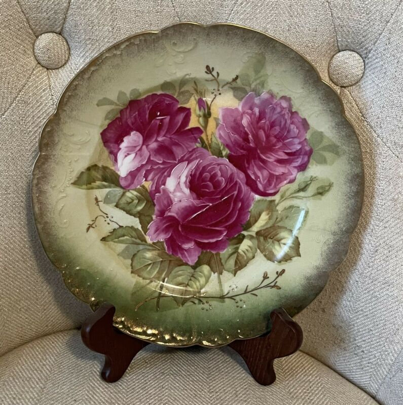 Title (ebay affiliate link): Antique Vintage Huge Pink Cabbage Roses Green Plate Bavaria 9.25" Gilt