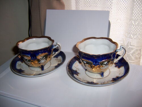 ANTIQUE Victorian Blue White and gold THREE FOOTED TEA CUP AND SAUCER pretty 2