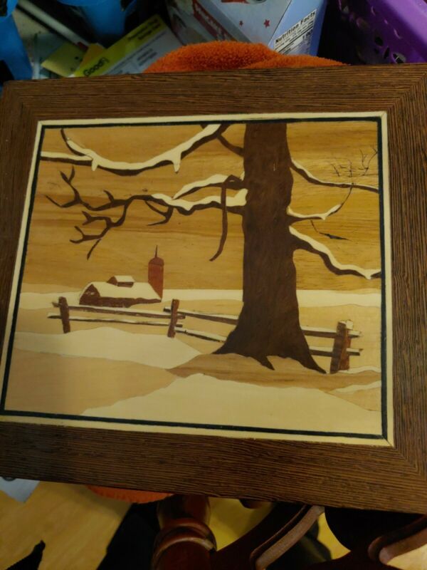 Title (ebay affiliate link): PARQUETRY/MARQUETRY INLAID WOOD SNOWY SCENE Farm/Barn Tree PICTURE.1990 signed