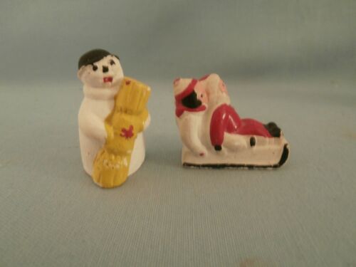2 TINY VINTAGE MINIATURE CHALK CHALKWARE SNOWMAN KIDS FIGURINES MADE IN ENGLAND
