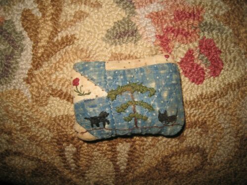 Title (ebay affiliate link): Primitive tiny Sampler Pillow~The Black Dog & Cat~Early Blue Quilt~Folk Art