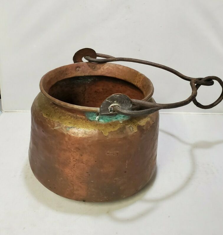 Title (ebay affiliate link): Antique Copper Pot Cauldron Hand Hammered Round Bottom Hanging Riveted