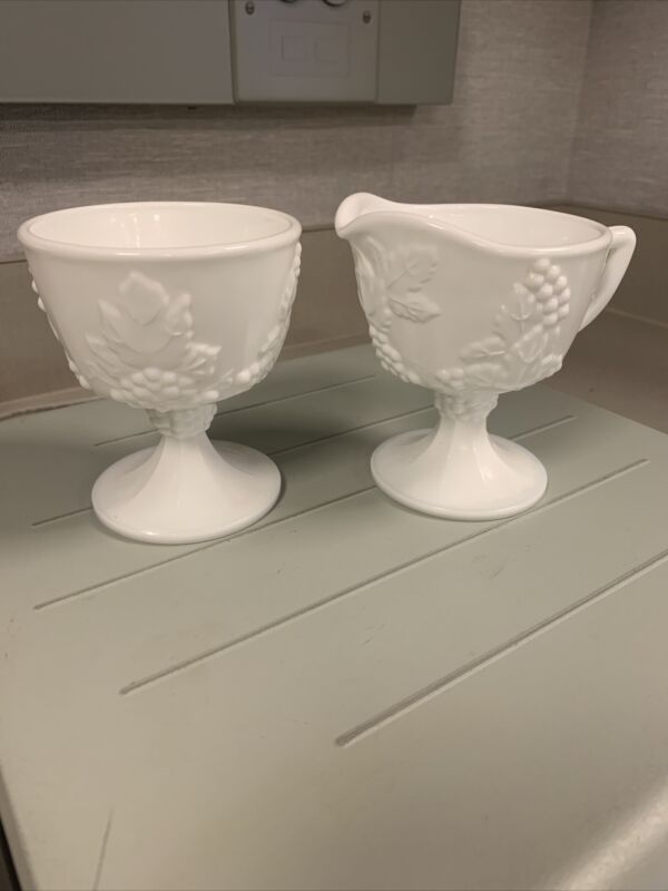 Title (ebay affiliate link): VINTAGE WESTMORELAND MILK GLASS PEDESTAL CREAM & SUGAR, GRAPE, MINT CONDITION