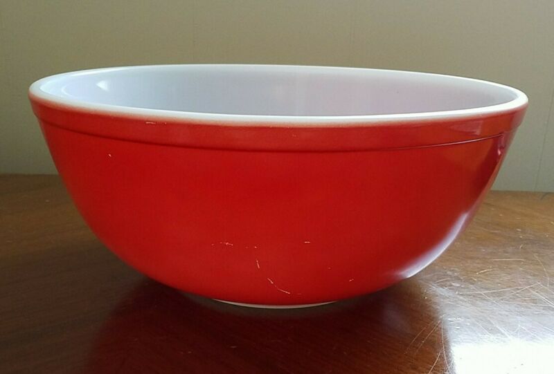 Title (ebay affiliate link): Vintage Pyrex Red Mixing Bowl Marked 404 34 10 Inches Wide by 4 1/2 Inches tall