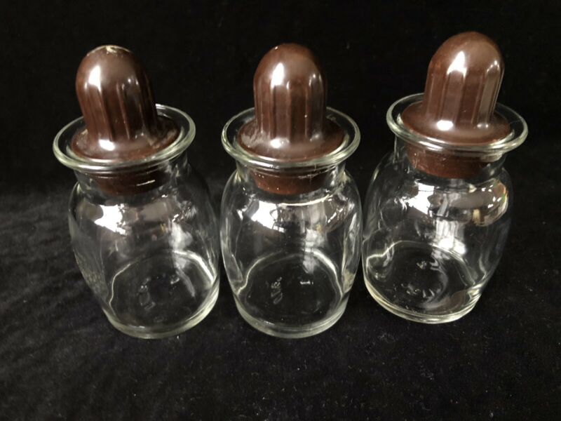 Vintage Clear Glass Apothecary Jars Brown Plastic Stoppers Lot Of 3