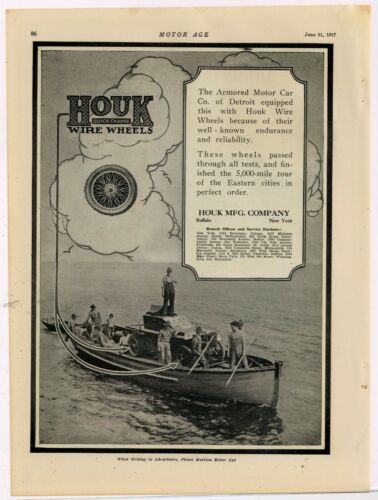 Title (ebay affiliate link): 1917 Houk Mfg Co Ad: Wire Wheels - Buffalo, New York - WW 1 Armored Car in Boat